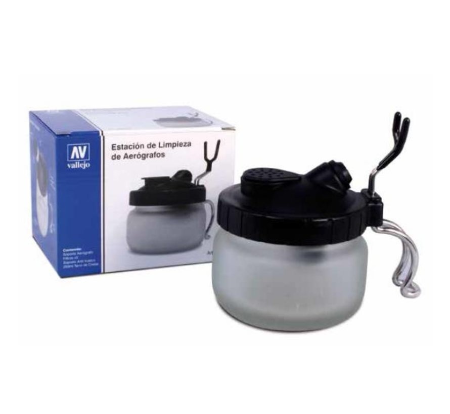 Der Vallejo Airbrush Cleaning Pot ist ein Glastopf mit Kunststoffdeckel, der zum Entleeren des Airbrushbechers und zur Reinigung der Airbrush selbst verwendet werden kann. Die Airbrush wird in die Öffnung des Kunststoffdeckels gestellt und gereinigt, indem der Pinsel ausgespült und mit Airbrush Cleaner oder Wasser in den Becher gesprüht wird. Die Luft wird durch den Filter wieder ausgeblasen und das Abwasser mit der Farbe verbleibt im Glasbehälter. Der Sprühbehälter hält den Arbeitsbereich frei von Schmutz und Farbdämpfen, während die Airbrush gereinigt wird.