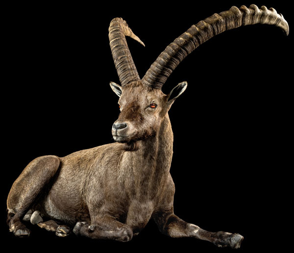 PU-Ganztierform für ein Präparat eines Alpensteinbocks. Liegende Position, nach rechts gedreht. Für einen mittelgroßen Steinbock. Lieferung ohne Hörner. Abmessungen (A x B x C x D x E): 16,8 x 31 x 50 x 143 x 107 cm