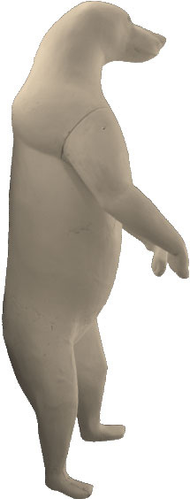 PU-Ganztierform für ein Präparat einer mittlerer bis großer Braunbär, auch für sehr großen Schwarzbären geeignet. Aufrecht stehend, Blick gerade, mit geschlossener Fang. Vorderläufe separat geschäumt. Abmessungen (A x B x C x D x E): 17,5 x 39 x 85 x 188 x 130 cm