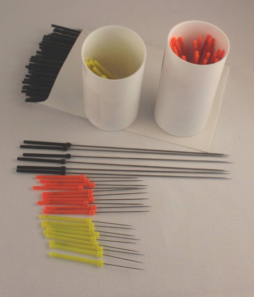 Fixiernadeln in verschiedenen Größen, 100 Stück pro Packung. Jeder Stift enthält einen Kunststoffgriff für einen guten Halt.