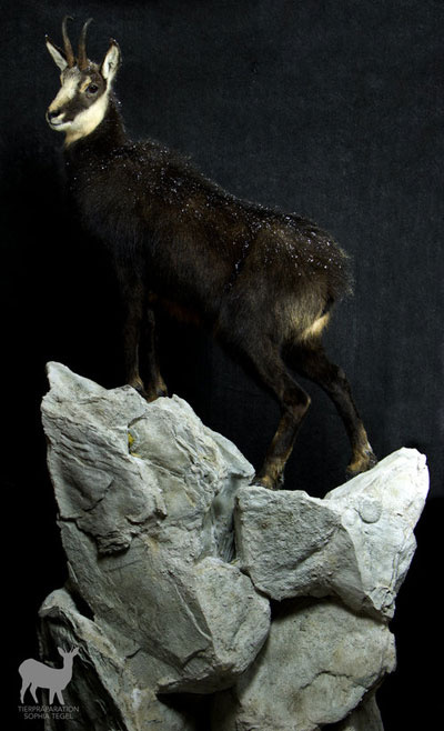PU-Ganztierform für ein Präparat eines Gams, stehend, vorne erhöht. Blick nach links oder rechts gedreht. Für eine mittlerer bis starker Gamsbock. Wird ohne Krücken geliefert. Abmessungen (A x B x C x D x E): 13,6 x 22 x 32 x 115 x 79 cm.