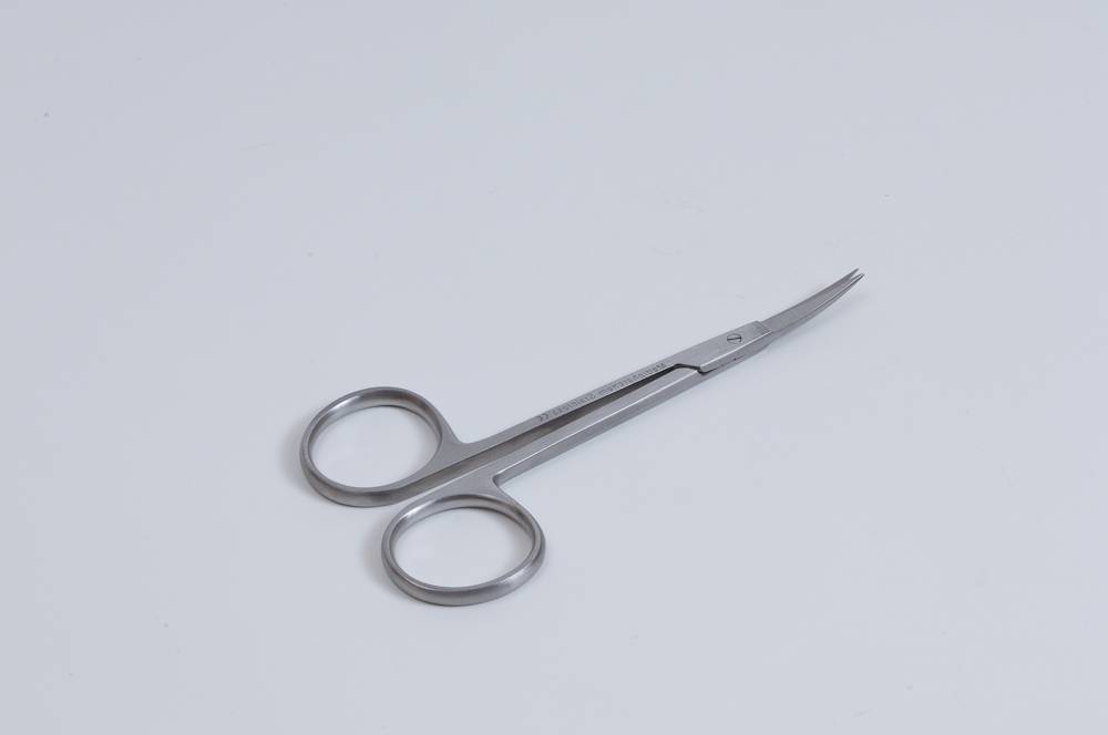 Irisschere, gebogen, aus rostfreiem Stahl. Die Spitzen der Schere haben das Modell 'spitz/spitz'. Mehrere Längen verfügbar.