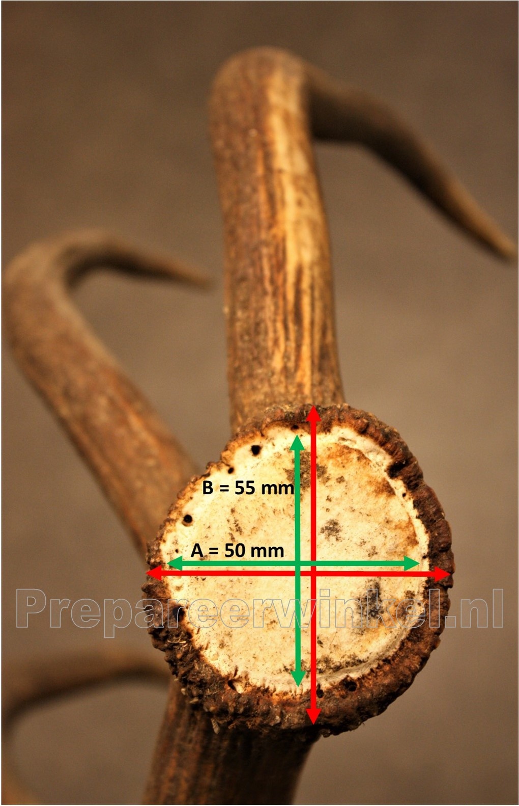 Die richtige Größe für einen künstlichen Schädel? Messen Sie das Innere der Öffnung in der Unterseite der Krücken kreuzweise und bestimmen Sie den (durchschnittlich) am besten geeigneten Durchmesser der Krücken und damit den Durchmesser des künstlichen Schädels. Siehe grüne Pfeile auf dem Bild mit Rothirschgeweih. Sind die Durchmesser sehr unterschiedlich? Nehmen Sie dann einen künstlichen Schädel der Größe A (achten Sie auf den Augenast, also im Beispiel 50 mm), d.h. die Größe der Rosenwurz im Gesicht. Ein zu dicker Rosenstock auf dem künstlichen Schädel sieht von vorne nicht schön aus!