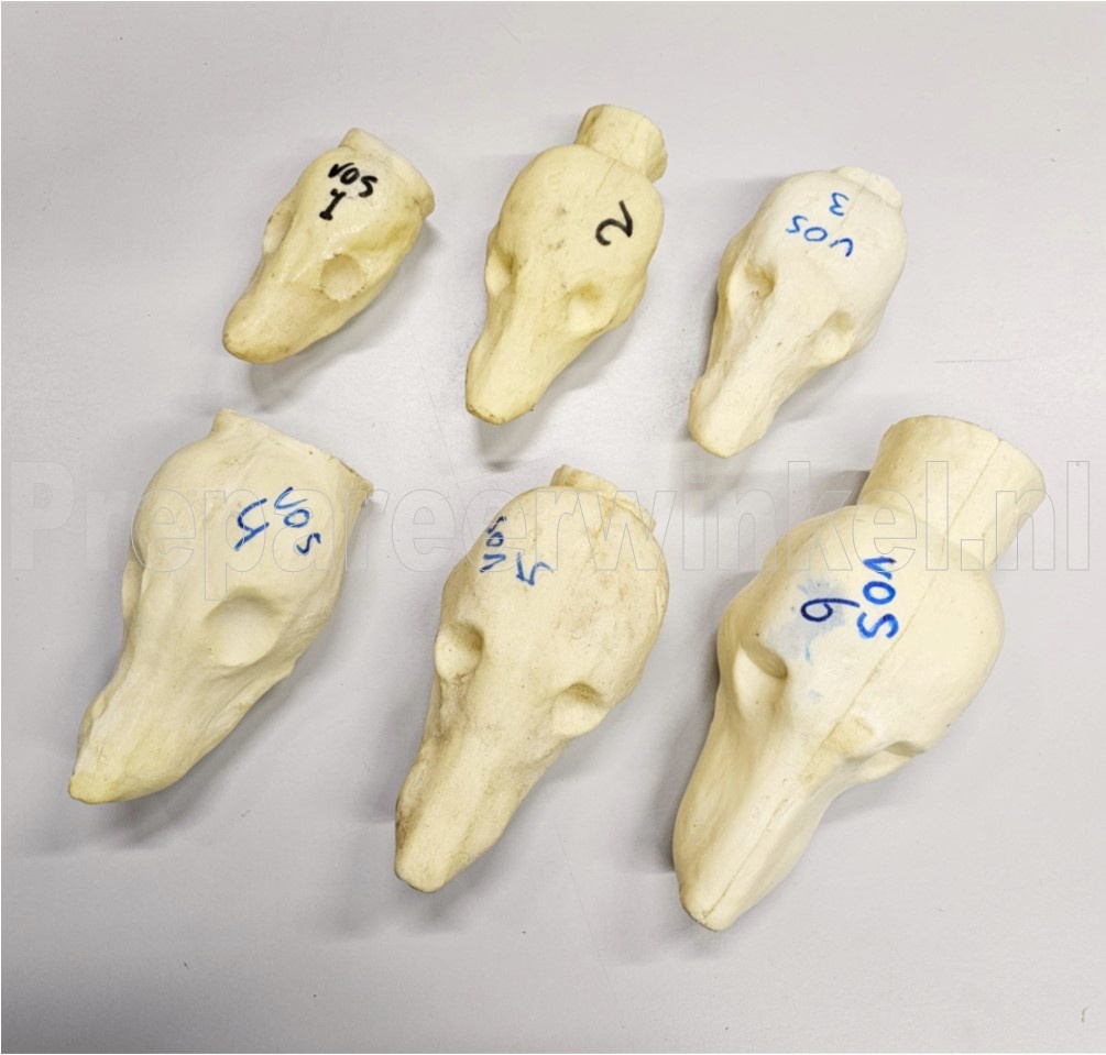 Wickelkopf aus PU-Schaumstoff für die Präparation eines Fuchses mit geschlossenem Fang. Diese Köpfe sind besonders praktisch, wenn der Schädel des Fuchses beschädigt ist und Sie den Körper mit Holzwolle wickeln, da Sie diese Köpfe dann leicht an den Körper wickeln können. Erhältlich in 6 Größen, von einem jungen Fuchs (“Blau”) bis zu einem großen ausgewachsenen Fuchs.
