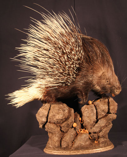 PU-Form für eine Ganztierpräparat einer mittlerer Stachelschwein. Stehend, etwas nach rechts blickend. Maßen (A x B x C x D x E): 9,5 x 15 x 27 x 82 x 48 cm