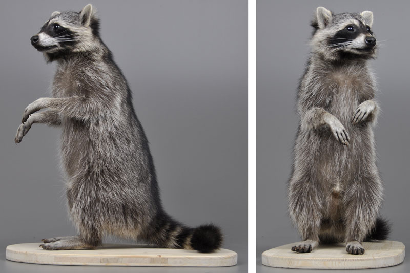 PU-Form für ein Präparat eines mittelgroßen Waschbären, aufrecht stehend, nach links oder rechts gedreht, geschlossener Fang. Die Beine sind separat geschäumt und werden mitgeliefert.