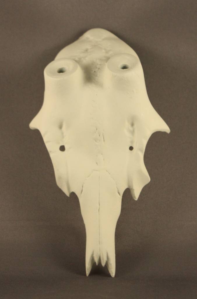 Artificial skull of a Roe buck for mounting shed antlers of a Roe buck, pedicle diameters 12 till 27 mm. The artificial skull is supplied with fixings for the rods and a bolt to fix the skull on a trophy panel.