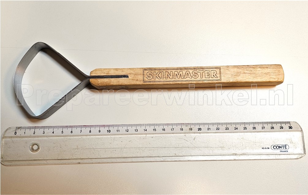 Skinmaster Pelt Scraper, square (for fat and meat), on one edge and sharp (for gristle) on the other. An excellent tool for muskrat, mink. Also very useful for touching up around edges and legs on the bigger critters. A well made, high quality instrument that will last you a lifetime.