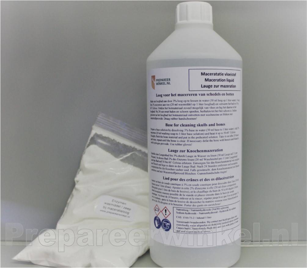 Base for cleaning skulls and bones. Prepare a base solution by dissolving 1,5 to 2% base in water (15-20 ml base to 1 liter water). Add 2% enzymes (20 ml washing soap to 1 liter base solution) and heat it up to 50-60° Celsius. Roughly flesh the bone material and put in the preheated solution. Take it out after 24 hours and rinse, repeat until the bone is clear. If necessary defat the bone with benzin and bleach it with hydrogen peroxide. Wear rubber gloves and eye protection! Opened bottles and/or package seals are excluded from the right of withdrawal due to health and/or environmental risks and may not be returned!