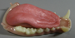 Tongue matching dentures for a raccoon. Relaxed, slightly gasping posture. The rubber tongue can be glued to the dentures with a special glue (Jaw juice).