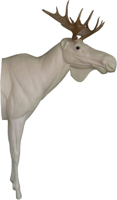 PU form for a life-size mount of a medium to large European Moose bull, standing, facing right. Also available as a half form (front). The form is supplied without eyes and antlers. Dimensions (A x B x C x D x E): 44 x 69 x 94 x 266 x 184 cm