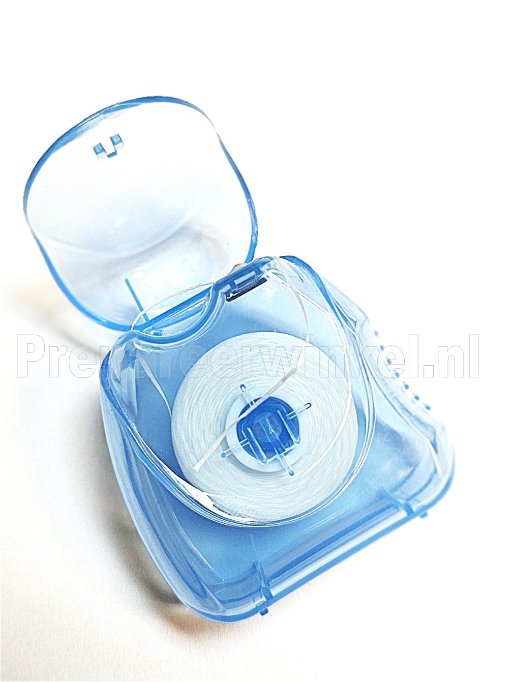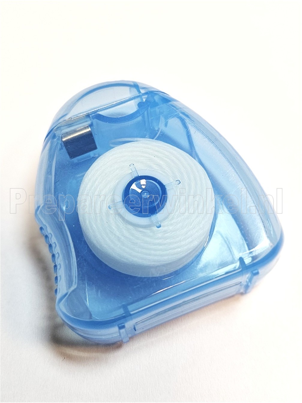 Suture thread, thin flat floss thread in a plastic dispenser. The spool contains approx. 50 metres of thread, colour white.