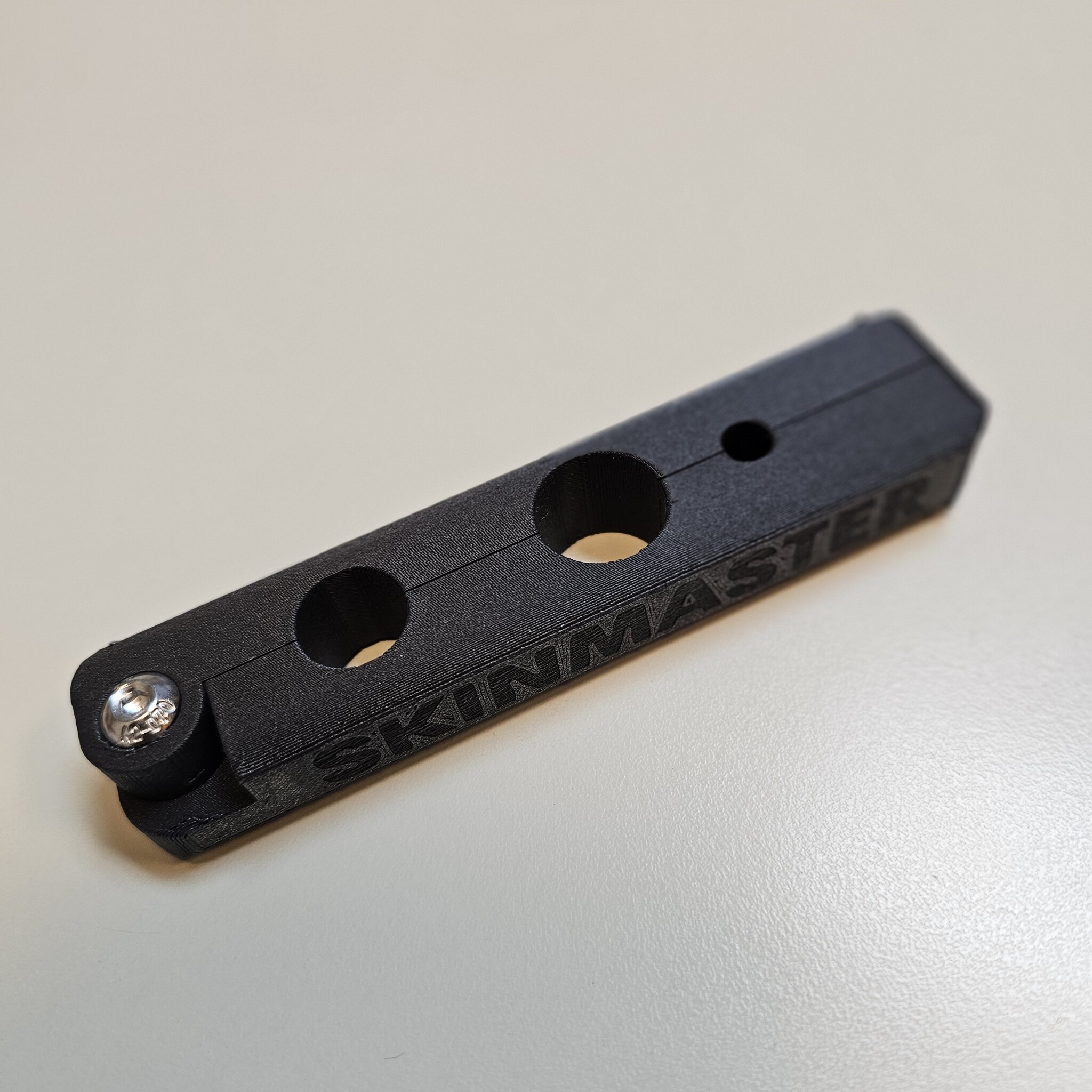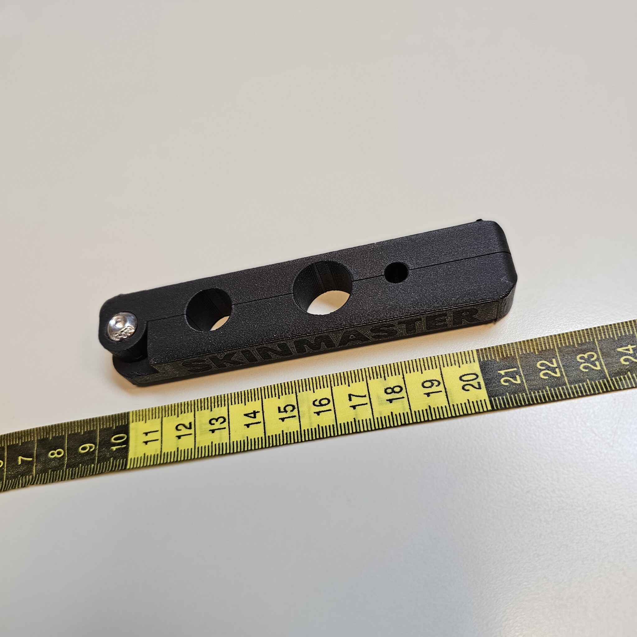 Tail stripper for easily removing the tail skin from the tail vertebrae when skinning mammals. Made of plastic with 3 openings of 6, 8 and 16 mm for tails ranging from small (squirrel) to large (fox). The rounded edges and rough surface make this tail stripper comfortable and sturdy to hold. There are two “pin-hole” locks on the inside of the tail stripper, which hook the two parts of the tail stripper together and prevent them from being pulled out of alignment during stripping.