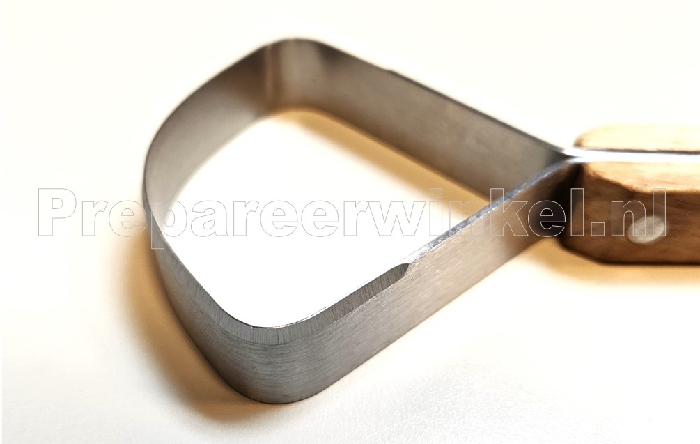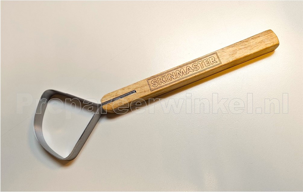 Skinmaster pelsschraper, vierkant (voor vet en vlees), aan de ene kant en scherp (voor kraakbeen) aan de andere kant. Een uitstekend gereedschap voor muskusratten, nertsen. Ook erg handig voor het bijwerken van randen en poten bij de grotere dieren. Een goed gemaakt instrument van hoge kwaliteit dat een leven lang mee zal gaan.