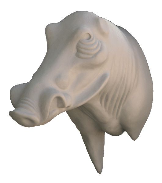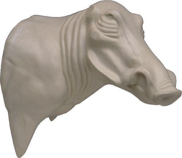 PU vorm voor een trofeekop preparaat van een middelgroot Knobbelzwijn, ook wel Wrattenzwijn genoemd. Offset, houding naar rechts kijkend, gesloten bek. Maten (A x B x C): 30,5 x 42 x 75 cm
