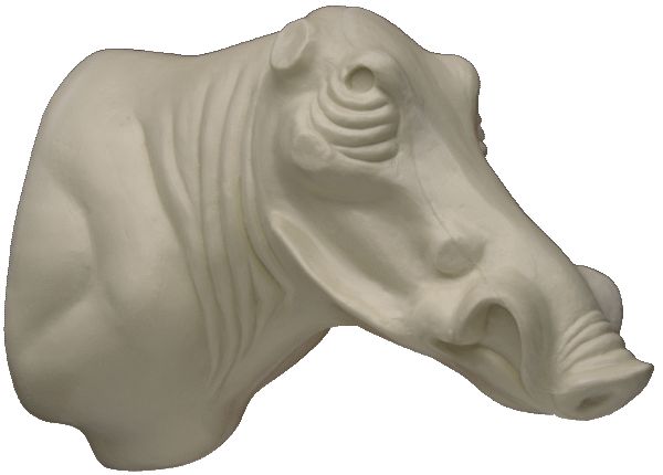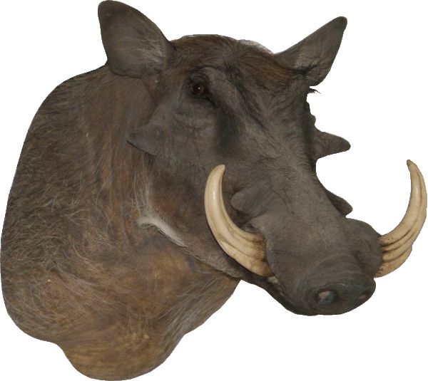 PU vorm voor een trofeekop preparaat van een middelgroot Knobbelzwijn, ook wel Wrattenzwijn genoemd. Houding rechtuit kijkend, gesloten bek. Maten (A x B x C): 30,5 x 42 x 72 cm
