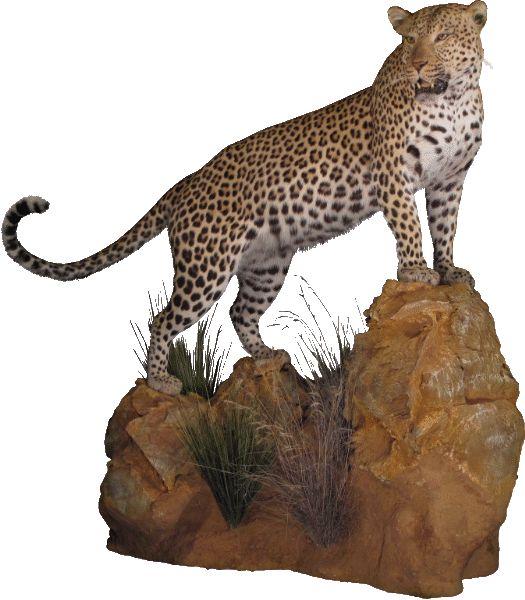PU vorm voor een life size preparaat van een zeer groot Luipaard, levend gewicht plm. 70 kg. Voor iets verhoogd staand, naar rechts gedraaid. Bek iets geopend. Maten (A x B x C x D x E): 10,5 x 28 x 58 x 134 x 80 cm