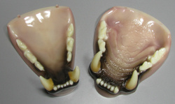 Kunstgebit voor een middelgroot tot groot luipaard, natuurlijk gekleurd. Maten (A x B): 7,4 x 3,7 cm
