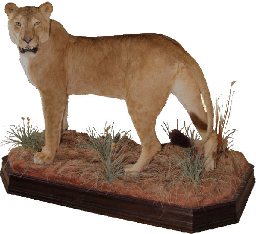 PU vorm voor een life size preparaat van een Tijger. Staand, naar links gedraaid. Bek iets geopend. Vorm is voor een leeuw, maar met enkele aanpassingen prima geschikt voor een tijger te maken. Maten (A x B x C x D x E): 15,2 x 35 x 60 x 169 x 103 cm